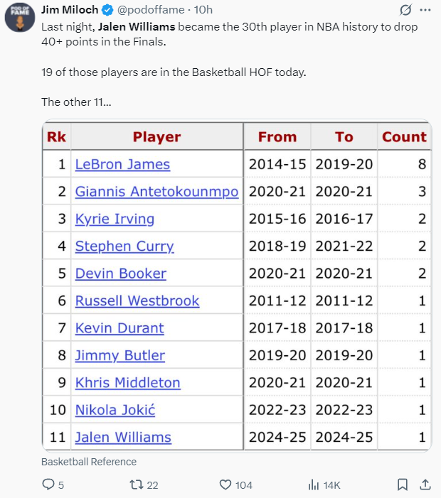 4.NB历史上第30位在总决赛拿到40+的球员,其中有19位已经进入名人堂;